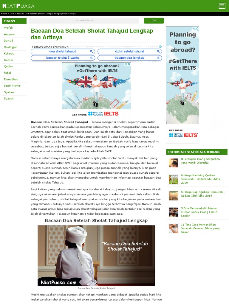 Doa Tahajud Beserta Artinya / 3 - Ushalli sunnatat tahajjudi rak'ataini lillahi ta'ala.. Aku niat sholat sunna tahajud 2 rakaat, menghadap kiblat, karena allah ta'ala. setelah membaca niat sholat tahajud, lakukan sholat 2 rakaat dengan 2 kali sujud dan 1 kali salam. Bacaan doa setelah sholat tahajud lengkap dengan tulisan latin dan artinya. Kamu bisa melakukan sholat tahajud pada waktu mendekati dua pertiga malam hingga waktu menjelang sholat subuh. Sholat tahajud adalah sholat sunnah yang dilakukan pada malam hari, yakni pada sepertiga malam akhir atau setengah malam akhir. Nov 09, 2020 · doa setelah sholat tahajud beserta artinya ini akan memudahkanmu untuk bisa memahami makna yang ada dalam doa tersebut.